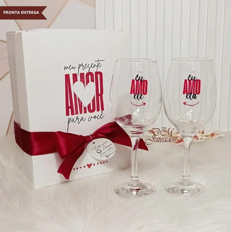 Este lindo kit contém 2 taças de vinho modelo Barone, com gravação UV nas cores preta e vermelha, com as frases românticas: