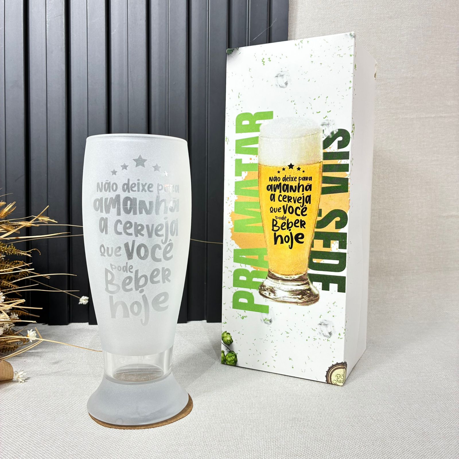 Este kit é ideal para surpreender os amantes de cerveja com um toque criativo e descontraído. Ele inclui um belíssimo copo Munich jateado, com a frase estampada: