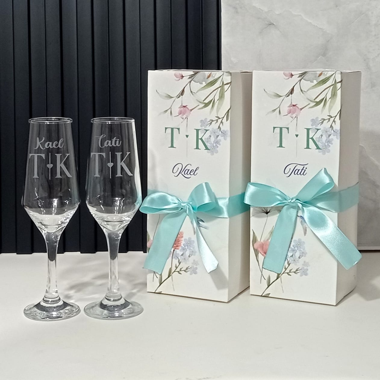 Kit personalizado Individual de 2 Caixas Branca + 2 taças champanhe gravação jateada.